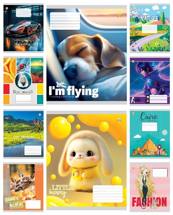 Зошит з повнокольоровою картонною твердою обкладинкою, "WiLL". Внутрішній блок - папір офсетний, білизна 98%, щільність вн. блока 55 гр./м2, поля червоні; обкладинка - крейдований папір щільністю 170 гр./м2