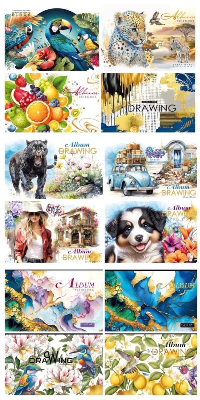 Альбом для малювання, 100г, на скобі, 202х292 мм, 30 аркушів. Перфорація блоку. Обкладинка Папір мелований 200 г/м2. Друк: 4+0. Захисний лак.